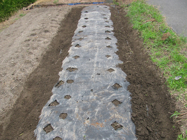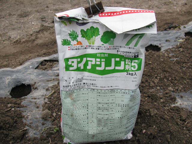 マルチを張り終えたら、植え穴を掘って、害虫予防のダイアジノンをパラパラと入れてやった。