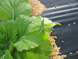 アオムシやヨトウムシじゃなくて、デカいバッタが葉をムシャムシャ食ってやがった。あの食欲には本当に困っちまうぜ。