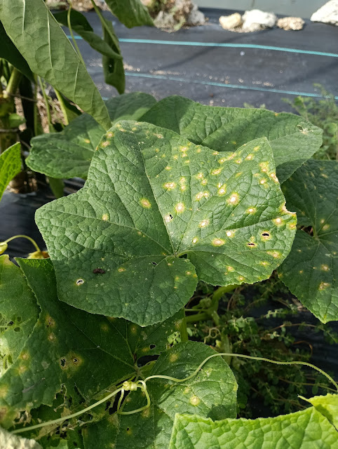さらにだ!きゅうりの葉っぱには、なんか茶色の斑点が広がってやがる。どうやら病気みたいだな。このまま放っておいたら、せっかくの野菜が全滅だ。それだけは絶対にごめんだぜ!