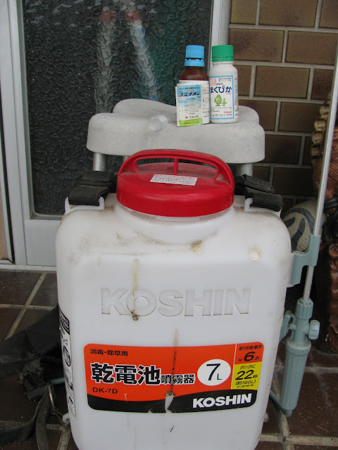 選んだのは「スミチオン乳剤」の1000倍液だ。これを噴霧器に入れて、ナスの葉っぱの表も裏も、徹底的に散布してやったぜ。