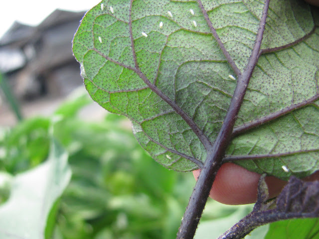 昨日、コナジラミが減ったと安心したのも束の間、ナスの葉っぱを見たら、コナジラミが爆発的に増殖してやがる!